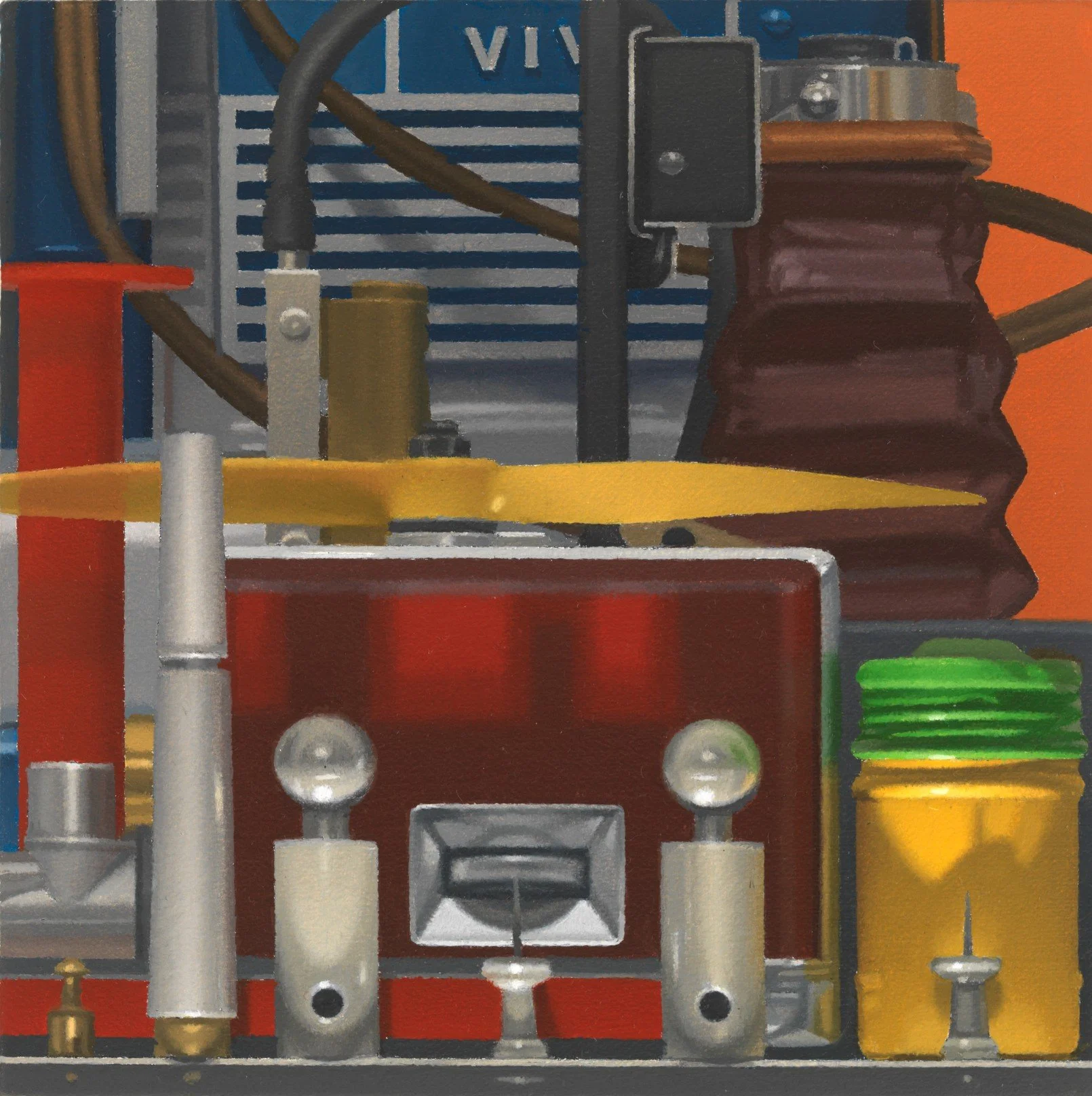 Vintage movie and slide projectors, model airplane engines, cameras, and microscopes are just some of the objects Harold Reddicliffe paints in a realist style. The mechanical subjects are carefully rendered with oils against a monochromatic background, drawing attention to combinations of color, light, form, and geometry. He has stated that his work explores “the transformation that occurs when ordinary objects are subjected to extraordinary scrutiny.” The result is compositions at once abstract and figurative, both formal studies and explorations of mechanics.