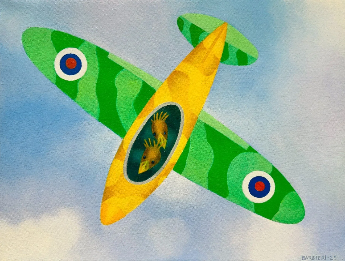 They live in a nether world of contradiction and confusion, flying airplanes, driving cars, standing around in bewilderment, challenging the viewer to accept the irrational with good humor and understanding. "Enzo" refers to Enzo Ferrari whom I saw close by, but did not actually speak to, on a visit to the Ferrari factory in 1966. I confess that he did not actually look like this, and I don't think he ever made or drove a car that wasn't red.” - Joseph Barbieri